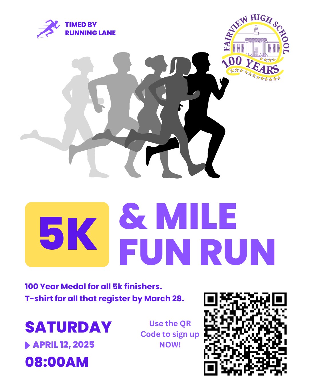 FAIRVIEW, Ala. – As part of the Fairview High School 100 Year Celebration, a 5K race and Mile Fun Run will take place Saturday, April 12.