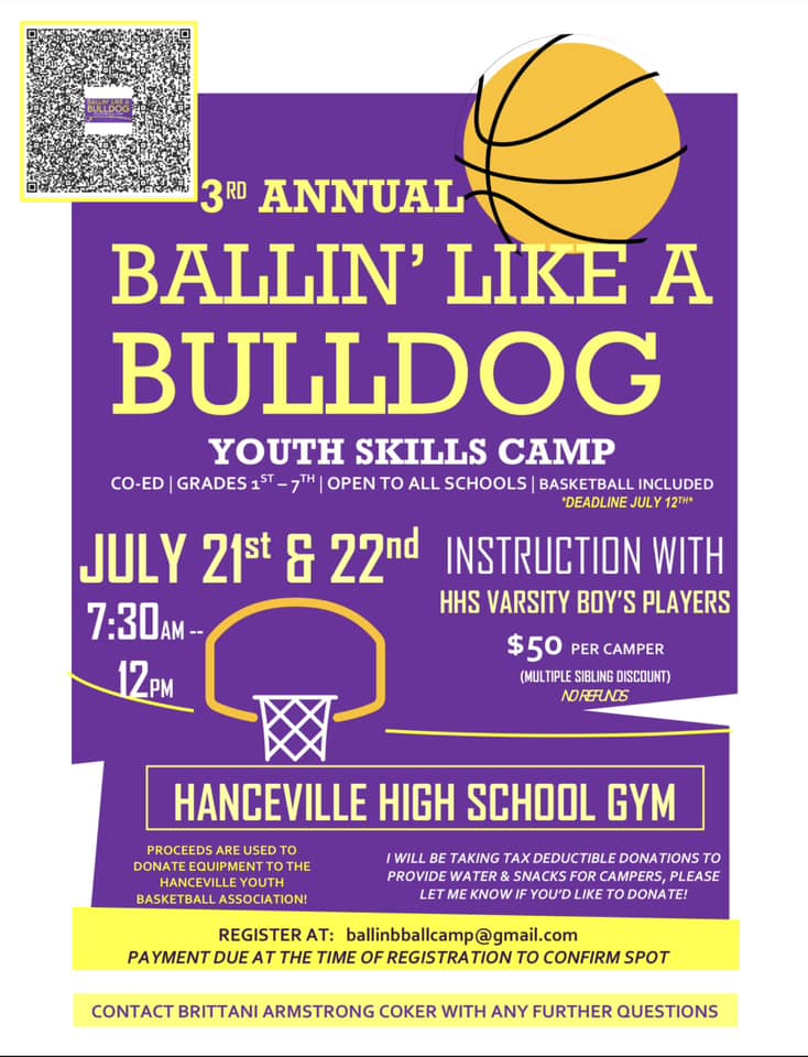 HANCEVILLE, Ala. – The third annual Ballin’ Like a Bulldog Youth Skills Camp, presented by B&D Construction, is set to take place July 21-22, from 7:30 a.m.-noon at the Hanceville High School gym. Registration is currently open to boys and girls entering first through seventh grades in August 2025. The camp welcomes participants from across the county, regardless of school affiliation. The cost is $50 per camper, with discounts available for multiple siblings.