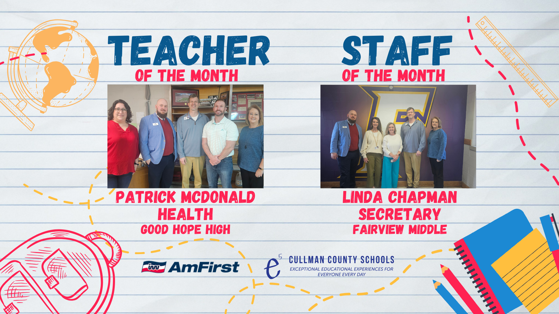 CULLMAN, Ala. – Cullman County Schools and AmFirst recognize a teacher and staff member each month of the school year who are going above and beyond in their professions.