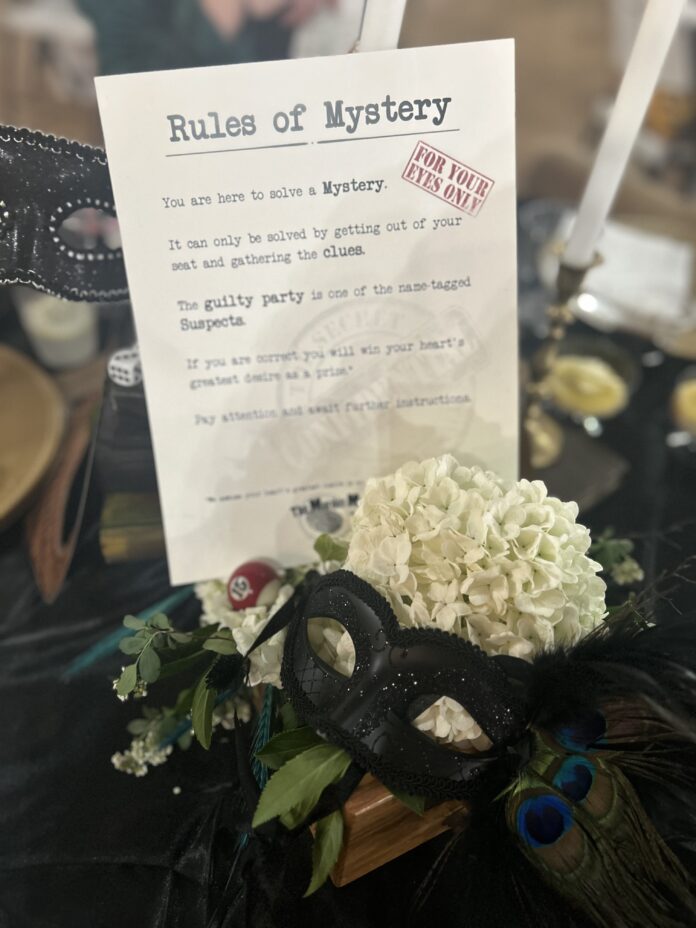 Gathered at Camp Meadowbrook, patrons were served a fancy meal while given the task of deciphering clues to solve a “murder.” Interactive character actors greeted visitors at the door, immediately immersing them in the story. During the game, some guests were selected to play colorful murder suspects like Miss Peach or Colonel Mustard, while others had to leave their seats to investigate the room and find clues to a possible murder suspect, with the guilty party being one of the name-tagged suspects. Murder suspects were interviewed by guests, who had to use critical thinking and skills of deduction to determine the identity of the murderer.