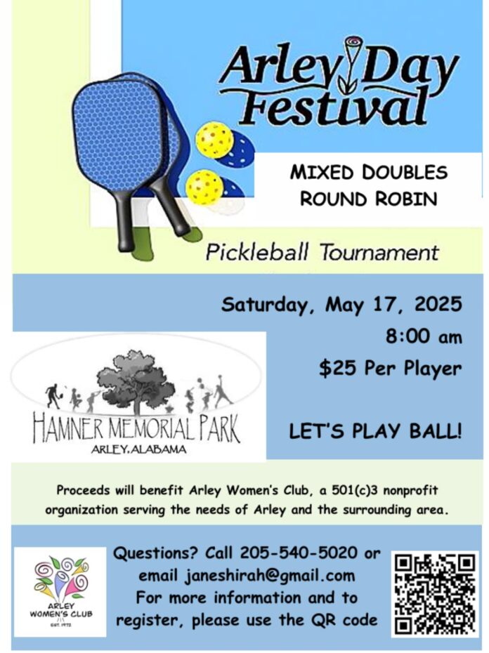 CULLMAN, Ala. – The Arley Day Festival will host its second annual Pickleball Tournament on Saturday, May 17, at Hamner Memorial Park in Arley. The tournament will begin at 8 a.m. and will follow a mixed doubles round-robin format. Entry is $25 per player and proceeds will benefit the Arley Women’s Club, a 501(c)(3) nonprofit organization supporting the Arley area.