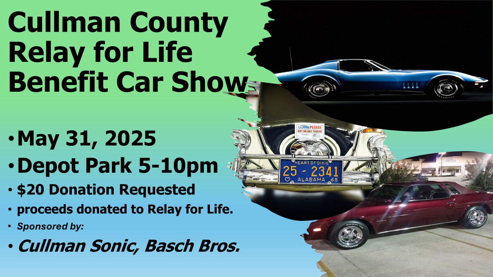 CULLMAN, Ala. – The community is invited to come out and support a good cause at the upcoming Cullman County Relay For Life Benefit Car Show, set for Saturday, May 31, from 5-9 p.m. at Depot Park in Cullman. Organized as part of Cullman’s Relay For Life efforts, the event aims to raise funds for cancer research and support services.