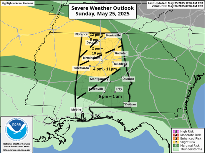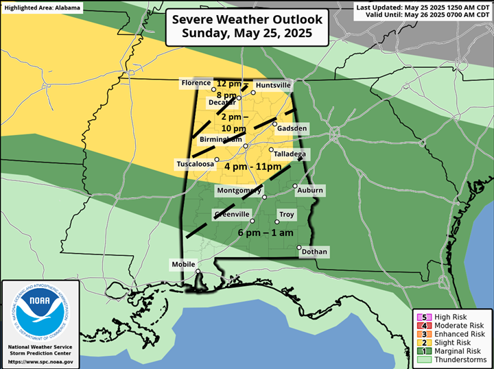 A line of storms is likely today, enter northern Alabama early to mid-afternoon and travel southward through the evening hours. Damaging wind gusts and hail will be the main threats, especially across the northern half of the state. As the line reaches the southern half of the state this evening, it will weaken with only a couple of damaging wind gusts possible. There is no tornado threat.