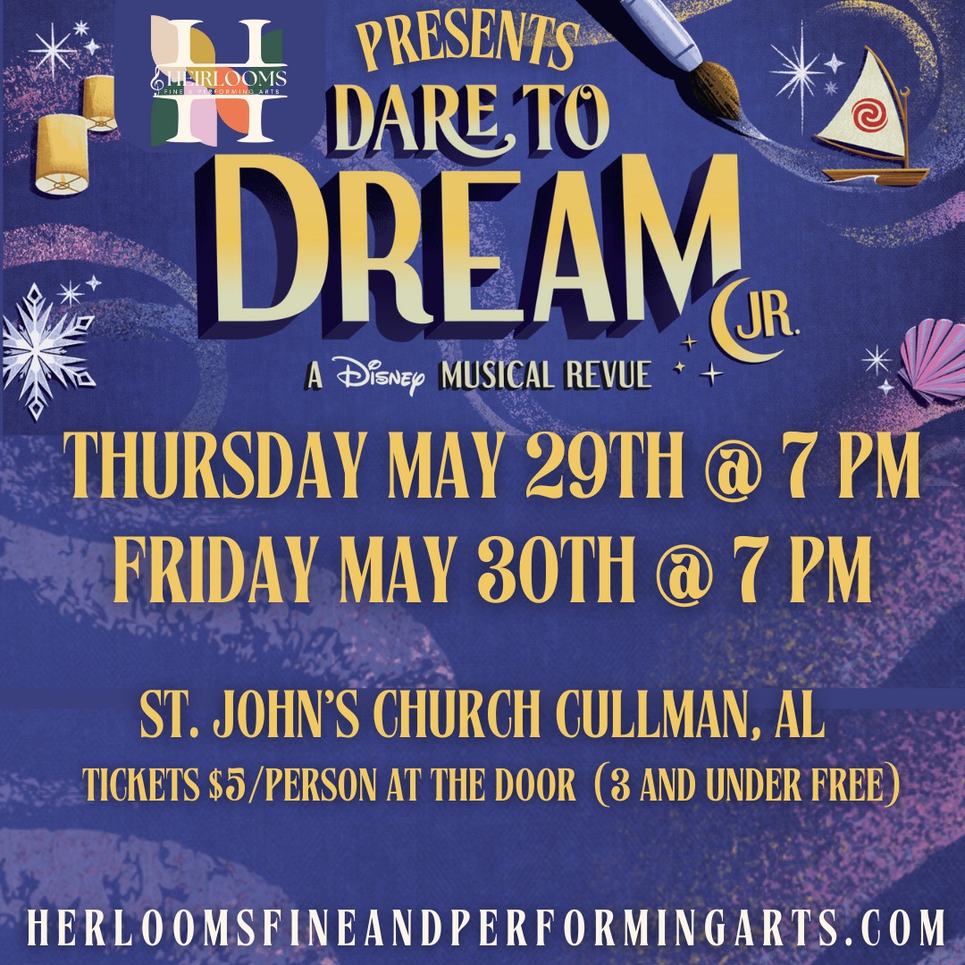 CULLMAN, Ala. – Heirlooms Fine & Performing Arts will present “Disney’s Dare to Dream Jr.,”a nostalgic celebration of Disney dreams, music and magic on Thursday, May 29, and Friday, May 30, at 7 p.m. at St. John’s Church in Cullman. Tickets are $5 at the door and children ages 3 and younger get in free.