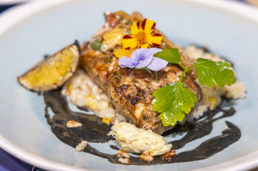 “The cobia belly is confited (slow cooked in oil or fat),” he said. “The lump crab meat is mixed in with a little bit of cream cheese, a little bit of lemon preserve and just a hint of salt to help bring out that flavoring of the lemon.”