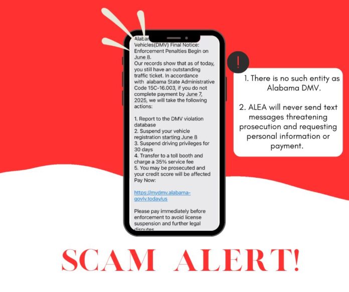 MONTGOMERY, Ala. – The Alabama Law Enforcement Agency (ALEA) is warning residents about a nationwide phishing scam that has recently targeted Alabamians with fraudulent text messages falsely claiming to be from the “Alabama Department of Vehicles (DMV)” and demanding payment for non-existent traffic tickets. These messages threaten to suspend individuals’ driving privileges for 30 days and suspend vehicle registrations unless recipients click a malicious link or provide personal information.