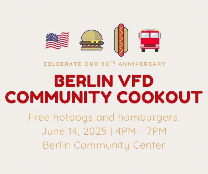 BERLIN, Ala. – The Berlin Volunteer Fire Department is celebrating its 50th anniversary with a community cookout on Saturday, June 14, from 4-7 p.m. at the Berlin Community Center.