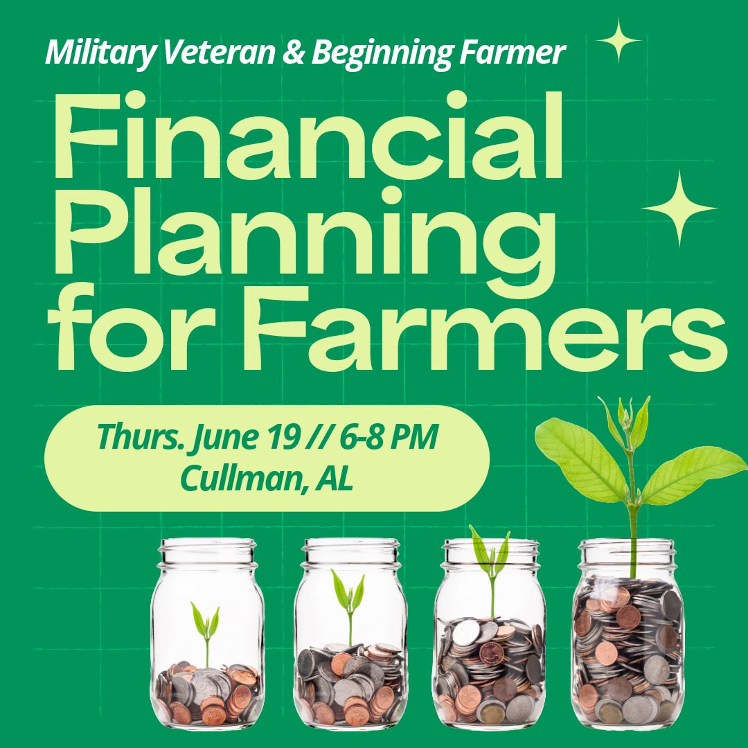 CULLMAN, Ala. – Local beginner farmers and veterans interested in exploring future financial strategies for farming are invited to attend the upcoming “Military Veteran & Beginning Farmer: Financial Planning for Farmers” workshop on Thursday, June 19, at the North Alabama Agriplex in Cullman. The free event will run from 6-8 p.m. and will include a light supper. Online registration is required.