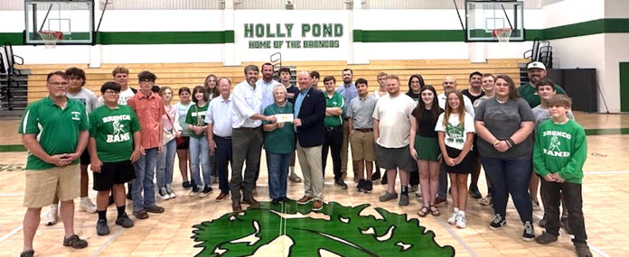 Gudger was surrounded by Holly Pond High Principal Dr. Nate Ayers, Holly Pond Mayor Carla Hart, former Rep. Randall Shedd, school board member Heath Allbright and several of the school’s students and teachers as he presented a ceremonial check representing the funding.