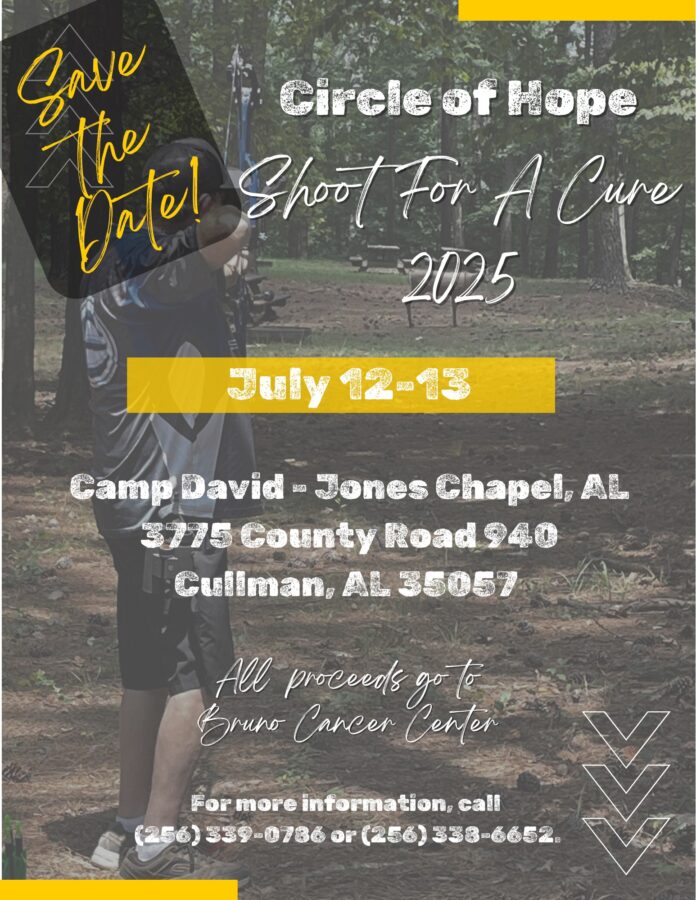 CULLMAN, Ala. – Circle of Hope is set to host the 18th Annual Shoot for a Cure 3D Archery Tournament on Saturday and Sunday, July 12–13, at Camp David in Jones Chapel. The tournament runs from 8 a.m. to 4 p.m. on Saturday and 9 a.m. to 4 p.m. on Sunday. Registration is available at the door, and archers of all ages and skill levels are welcome. All proceeds will go directly to the Bruno Cancer Center in Birmingham.