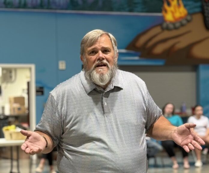 Stepping out of the director’s seat, Cullman Community Theatre’s Wayne Cook rehearses his stage role as Tevye the milkman. (Photo courtesy of Cullman Community Theatre)