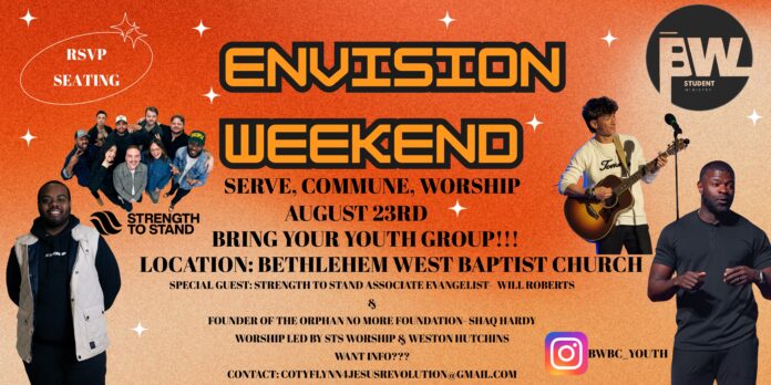 CULLMAN, Ala. – Youth pastors and leaders across Cullman are invited to bring their students to Envision Weekend, hosted at Bethlehem West Baptist Church on Saturday, Aug. 23, 2025.