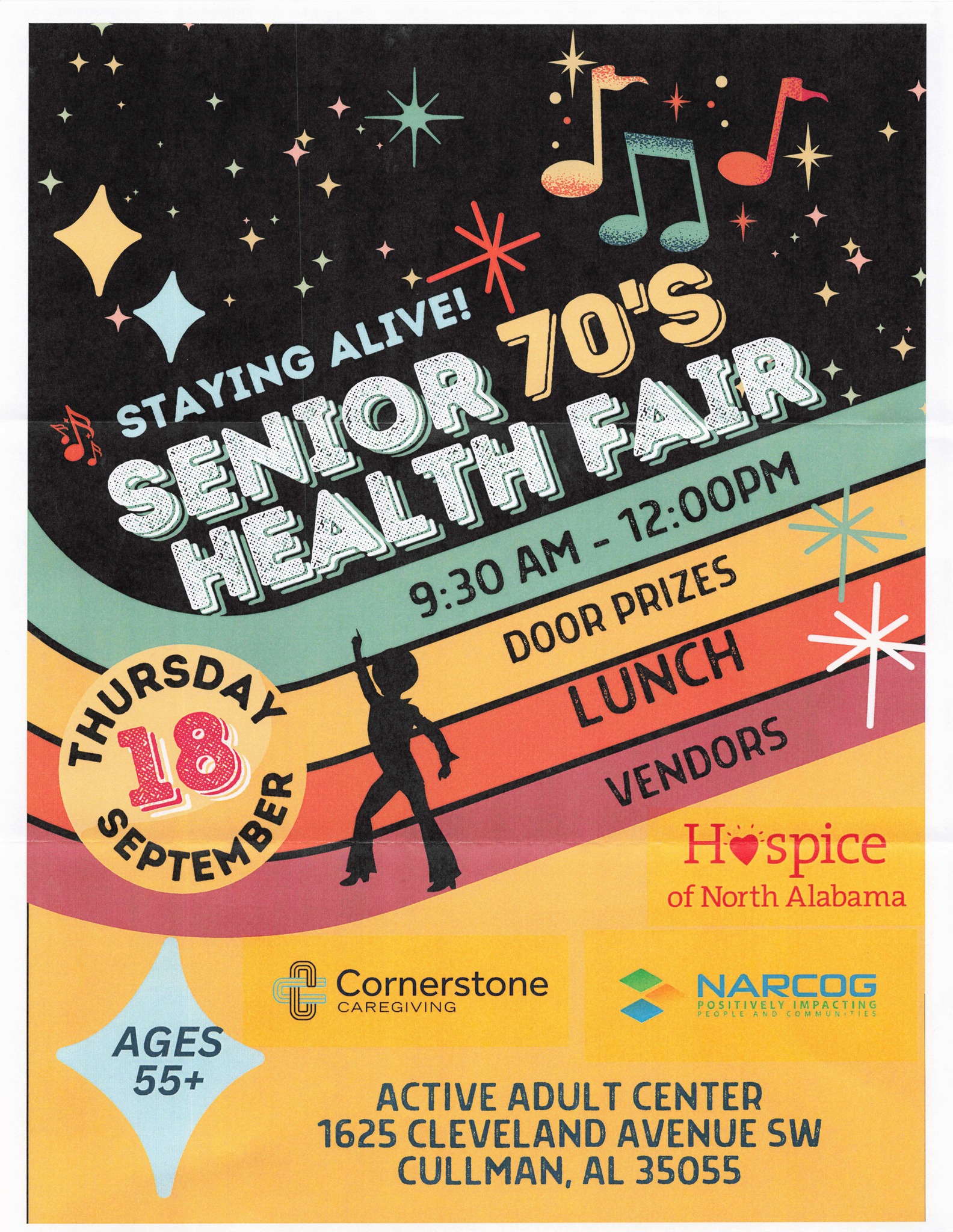 CULLMAN, Ala. – The Cullman County Commission on Aging will host its annual Senior Health Fair on Thursday, Sept. 18, from 9:30 a.m.-noon at the Donald E. Green Active Adult Center. The free event is open to adults 55 and older and will feature health services, resources and plenty of opportunities to show off their groovy 70’s dance moves.