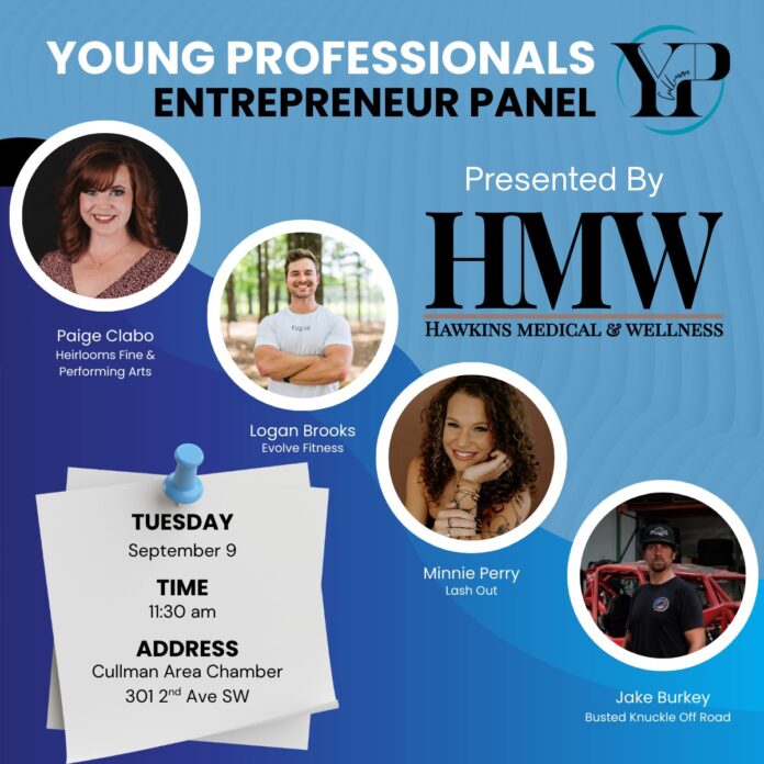 CULLMAN, Ala. – The Cullman Area Chamber of Commerce will host the Young Professionals Entrepreneur Panel on Tuesday, Sept. 9, at 11:30 a.m. at the Cullman Area Chamber. Presented by Hawkins Medical & Wellness, the panel aims to provide young and upcoming professionals with the opportunity to learn directly from local business owners. The event is free and open to ages 21–40. Refreshments will be provided.