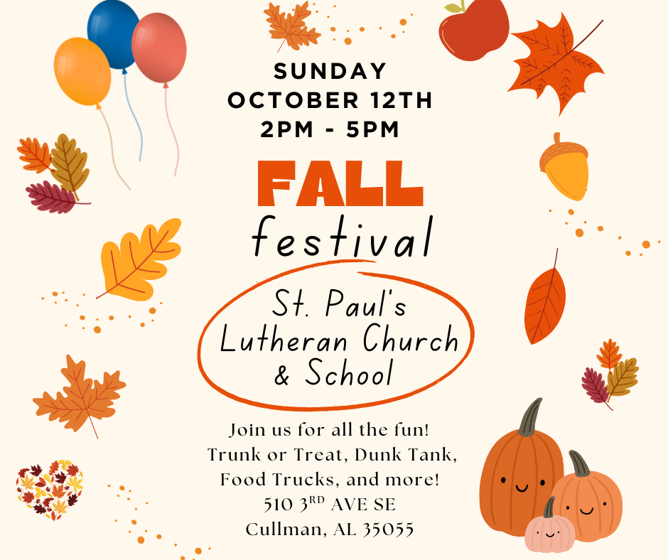 CULLMAN, Ala. – St. Paul’s Lutheran Church & School is excited to welcome the community to its annual Fall Festival, happening on Sunday, Oct. 12, from 2-5 p.m. at 510 Third Ave. SE, in Cullman.