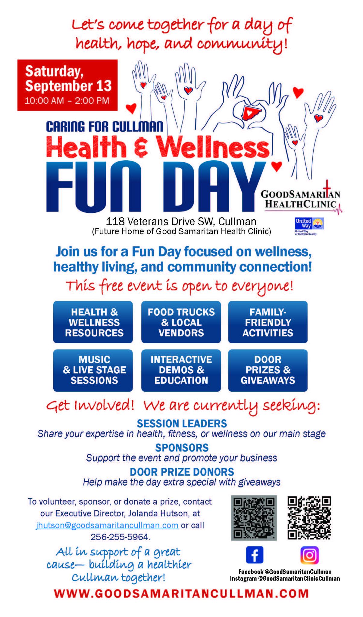 CULLMAN, Ala. – The Good Samaritan Health Clinic will host its Caring for Cullman Health and Wellness Fun Day on Saturday, Sept. 13, from 10 a.m.-2 p.m. at 118 Veterans Drive, beginning with a ceremonial groundbreaking at 10 for the clinic’s new 5,040-square-foot facility.