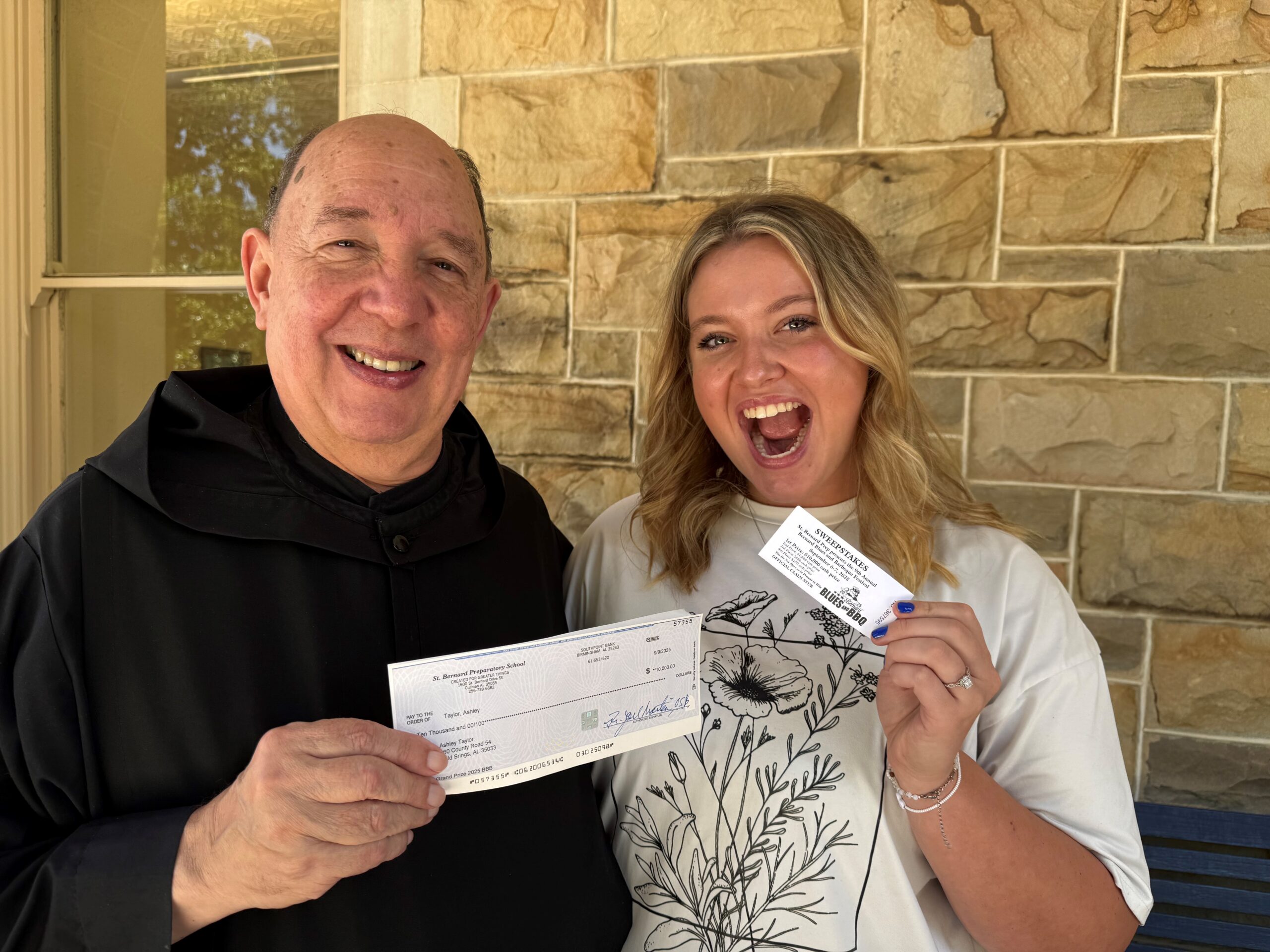 For Ashley Taylor, the timing of her win felt providential. Just hours before the drawing, she had texted her recently engaged daughter, Malaya, “I am gonna win $10K at 4 p.m. today to pay for your wedding. Pray!” Her daughter replied, “In Jesus Name.” When Fr. Joel Martin, president of St. Bernard Prep, announced her as the $10,000 winner, her prayer was answered.