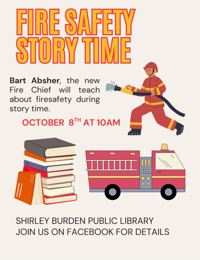 HANCEVILLE, Ala. – Hanceville Fire Chief Bart Absher will participate in a fire safety storytime on Wednesday, Oct.  8, at 10 a.m. at the Shirley Burden Public Library in Hanceville.