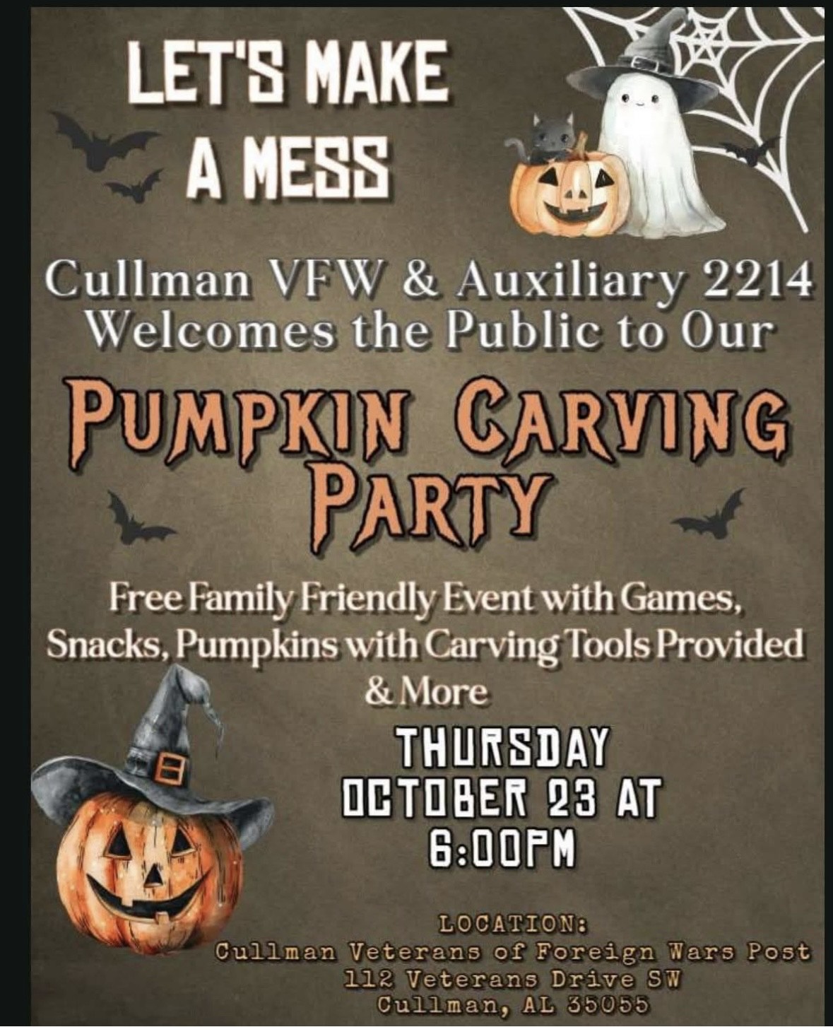 CULLMAN, Ala. – The Cullman Veterans of Foreign Wars (VFW) and Auxiliary will host their third annual pumpkin carving party event on Thursday, Oct. 23, at 6 p.m.