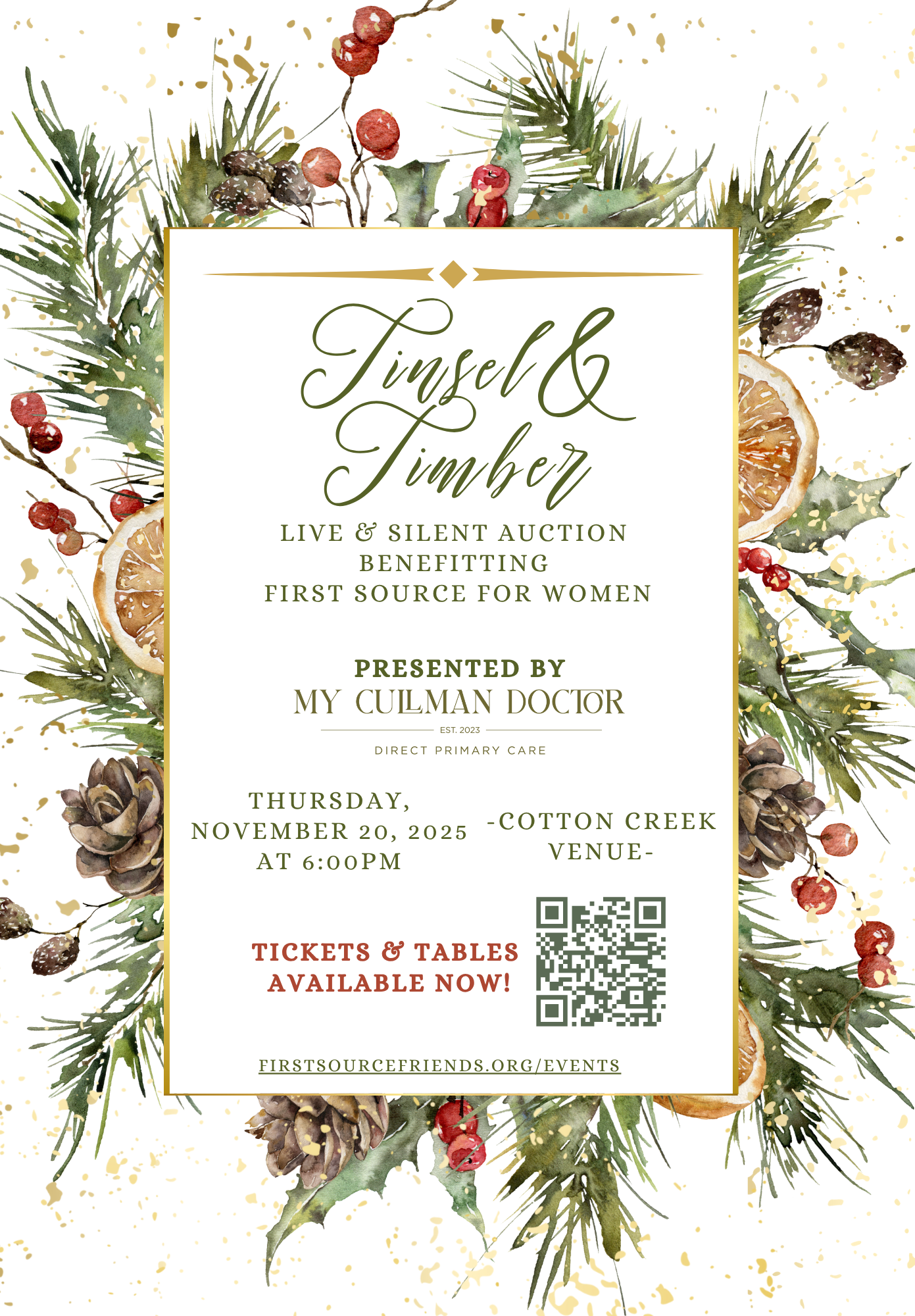 CULLMAN, Ala. – First Source For Women will host its annual Tinsel & Timber Live and Silent Auction on Thursday, Nov. 20, from 6-8 p.m. at The Venue at Cotton Creek in Cullman. Presented by My Cullman Doctor, attendees can look forward to a night of beautifully decorated Christmas trees, holiday décor and unique auction items. Guests are encouraged to dress in cocktail attire and enjoy heavy hors d’oeuvres prepared by Black Rock Bistro, homemade desserts, a charcuterie board and a hot chocolate bar.