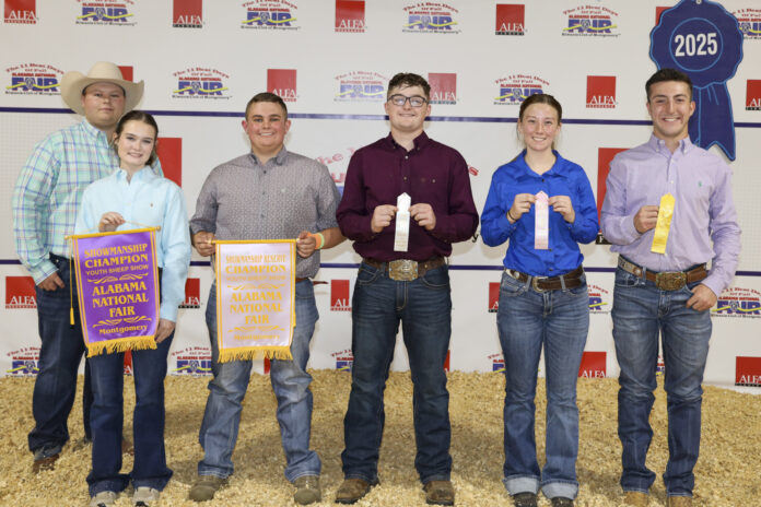 Senior Showmanship winners in the Youth Sheep Show at the Alabama National Fair Oct. 10, in Montgomery were, from left, Ella Alldredge of Blount County, grand champion; Mason Smith of Marshall County, reserve champion; Miles Williamson of Cleburne County, third place; Lexi Jones of Cullman County, fourth place; and Evan Roden of Cullman County, fifth place. Senior Showmanship is for exhibitors ages 16-19. Alabama Farmers Federation and Alfa Insurance sponsored youth livestock events at the fair. The winners are pictured with judge Adam Heffelinger of Indiana.
