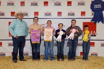 Junior Premier Exhibitor winners in the Youth Sheep Show at the Alabama National Fair Oct. 10, in Montgomery were, from left, Zoe Flowers of Montgomery County, grand champion; Dallis Carpenter of Talladega County, reserve champion; Palmer Mitchell of Montgomery County, third place; James Hembree of Cullman County, fourth place; and Stella Williamson of Cleburne County, fifth place. Junior Premier Exhibitor is for exhibitors ages 9-12 and con-sists of showmanship, livestock evaluation and a written test. Alabama Farmers Federation and Alfa Insurance sponsored youth livestock events at the fair.
