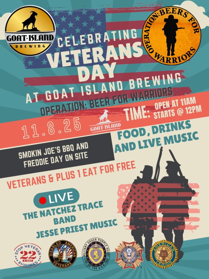 CULLMAN, Ala. – Goat Island Brewing will host a Veterans Day celebration on Saturday, Nov. 8, 2025, honoring local service members and their families through Operation: Beer for Warriors. The event will begin at noon, with doors opening at 11 a.m., and will feature live music performances by the Natchez Trace Band and Jesse Priest Music. Veterans and one guest will receive a free meal, with food provided by Smokin’ Joe’s BBQ LLC and Freddie Day Catering.