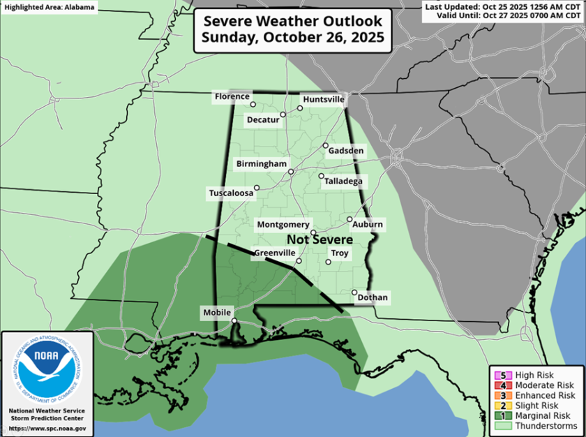 A couple of upper level disturbances will move across the southeastern U.S. on both Sunday and Monday. Rain will begin entering western Alabama around sunrise Sunday and spread eastward across much of the state throughout the morning. There may be a break in precipitation during the early afternoon before another wave of showers and storms begins by late Sunday afternoon and continues into Monday evening.