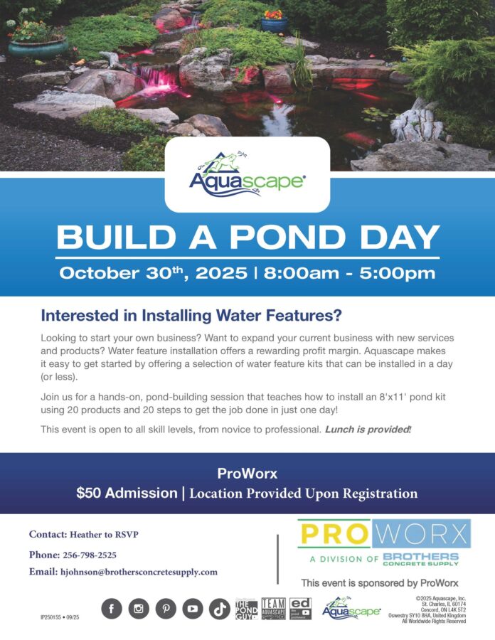 CULLMAN, Ala. – ProWorx, a division of Brothers Concrete Supply, will host a hands-on Build a Pond Day on Thursday, Oct. 30, from 8 a.m.-5 p.m. The full-day training event will guide participants through the step-by-step installation of an 8’x11’ pond kit, using a variety and products and techniques — all completed in one day.