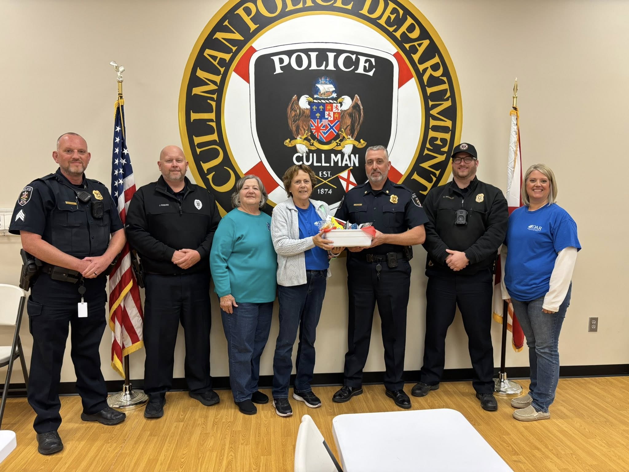 Snack baskets were presented to the Cullman Police Department, Cullman Fire Rescue, Cullman County Sheriff’s Office and Cullman County dispatchers, in honor of their care and protection of our community, by DAR members Athelia Gibbs, Anita Winslow and Chapter Regent Cathy Shallal.