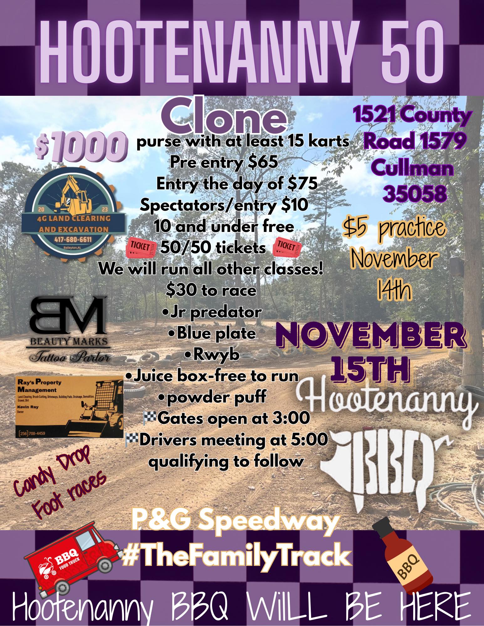 Food will be provided exclusively by Hootenanny BBQ, owned by Cullman native Maylon Jones, bringing his award-winning BBQ to the event. A 50/50 raffle will also take place, with ticket prices ranging from $1 to $20. Half of the total pot goes to the winner, and half supports the track.