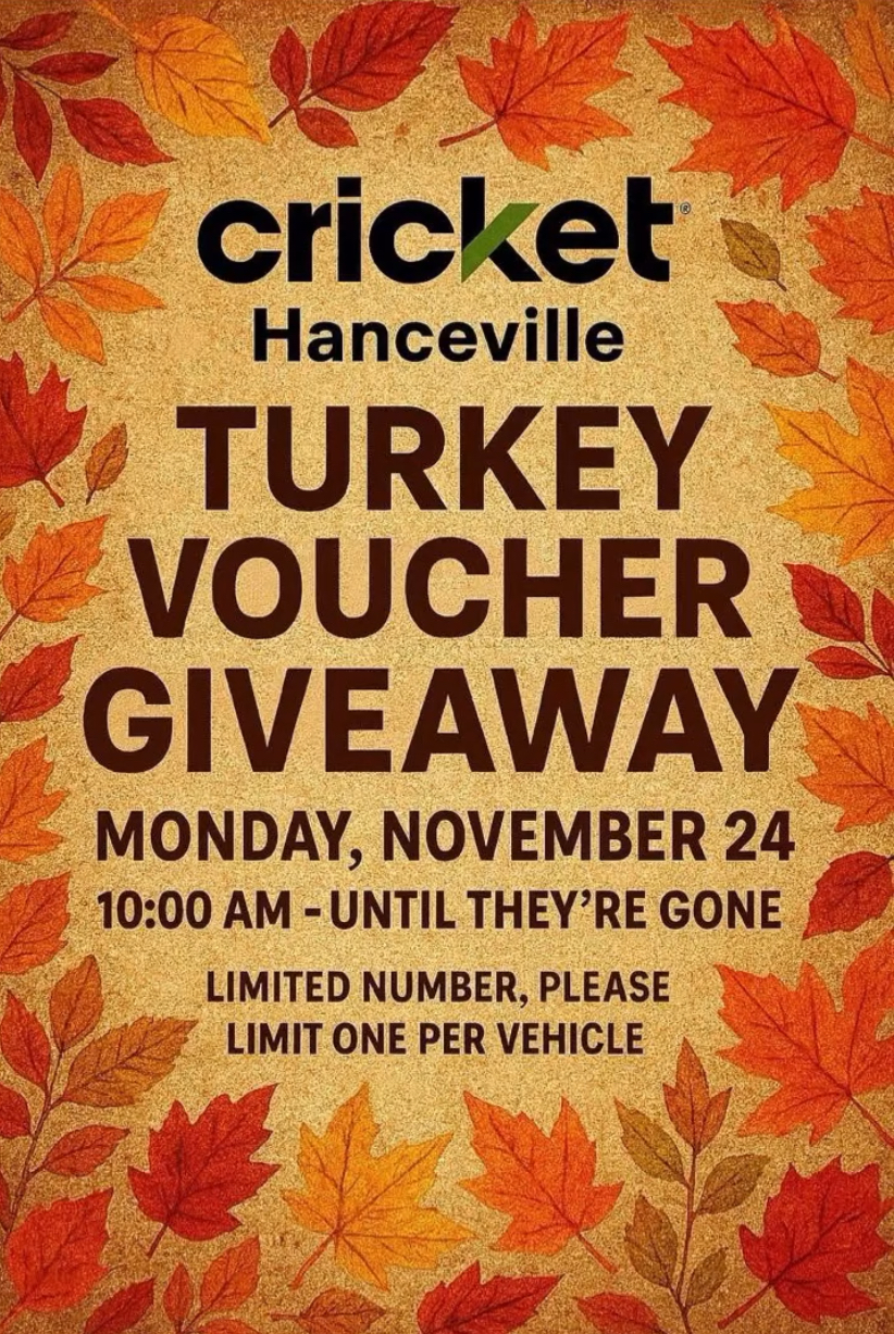 Cricket Wireless Regional Manager Abdullah “AB” Abumazen said that on Monday, Nov. 24, they’ll be giving out turkey vouchers at the Hanceville location.