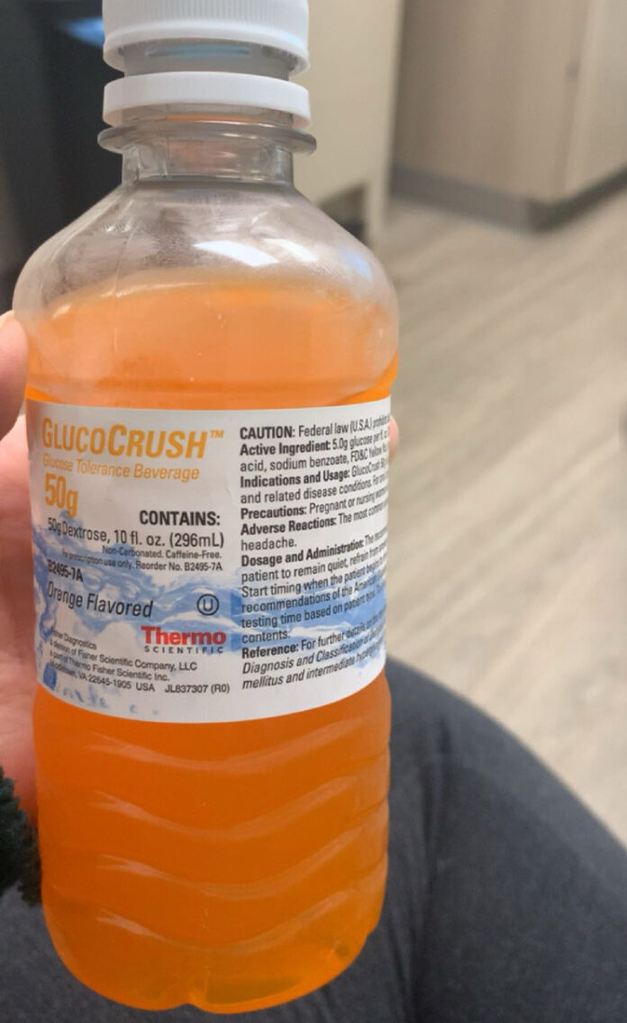 For those of you who don’t know what this is, allow me to explain. This is a mandatory test during pregnancy that measures the amount of glucose (sugar) in your bloodstream. This checks for gestational diabetes, which can pose increased risk to the baby and mama-to-be.