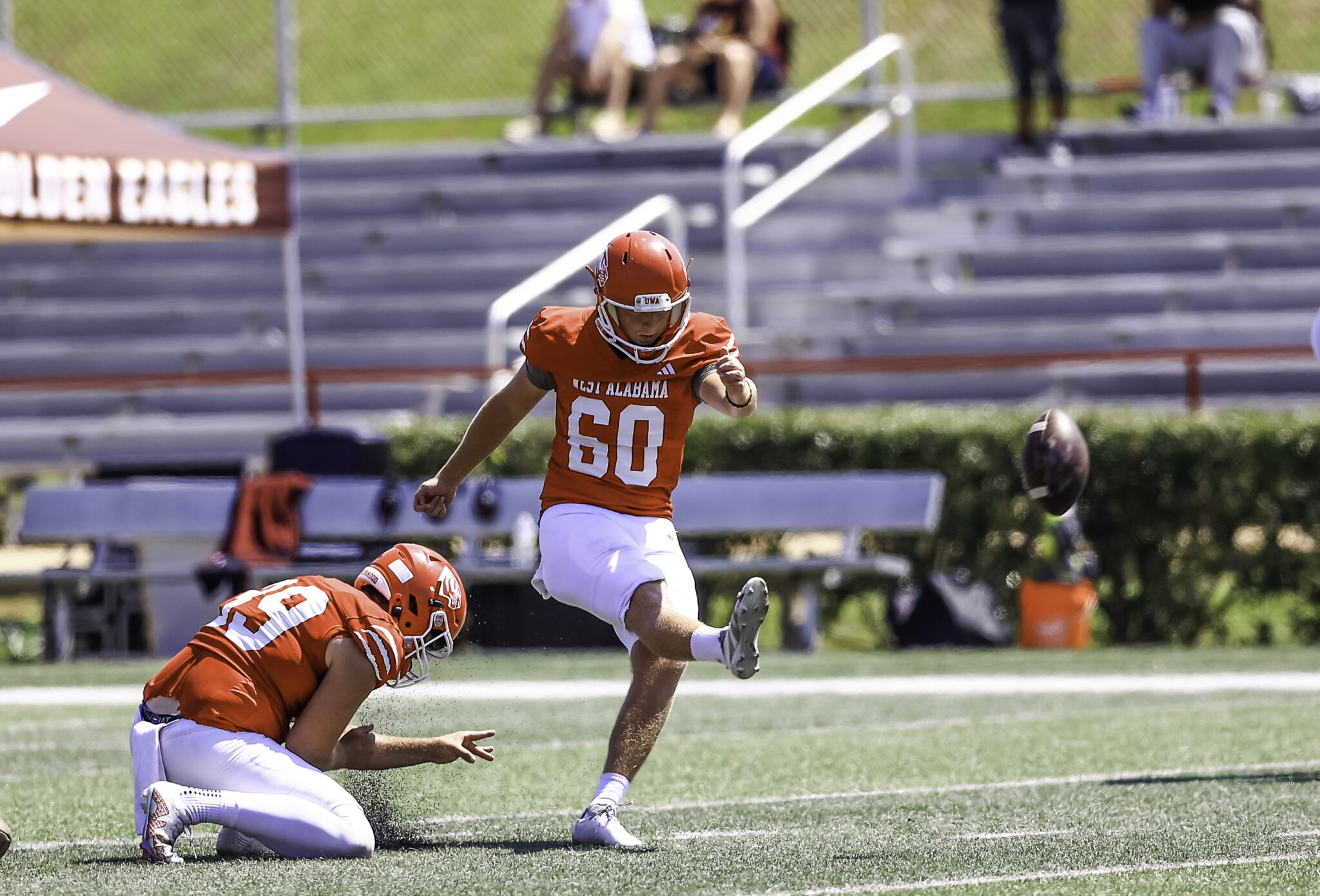 Fairview native, West Alabama's Elijah Guyton attempting a kick. (Photo via. Joe Chance)
