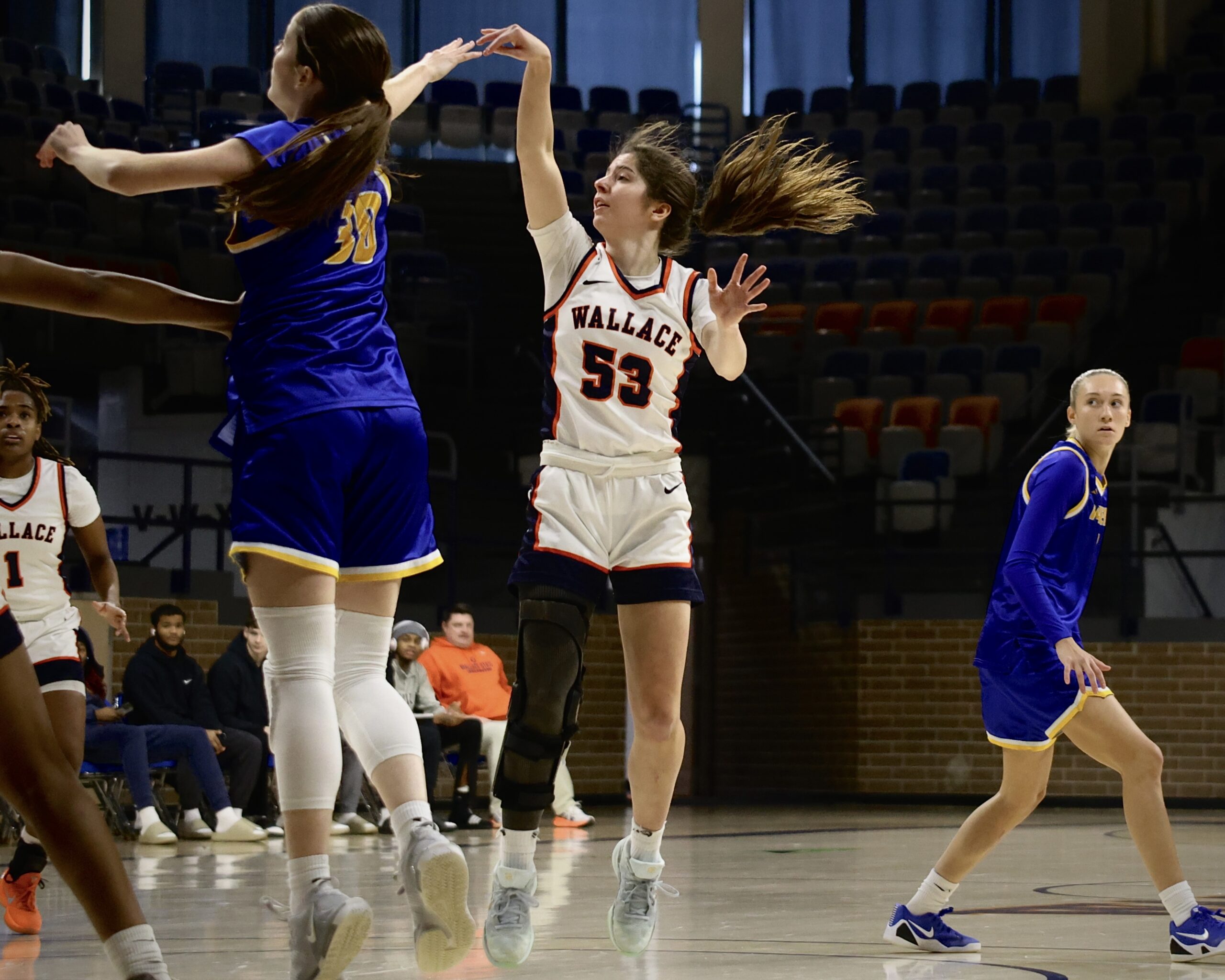 It’s visible on the court, especially in Simmons’ hard press defensive system. With a full-leg brace on, Tetro bounces around from player to player, frustrating ball handlers with active hands and sometimes even yelling at them when shooting or passing.