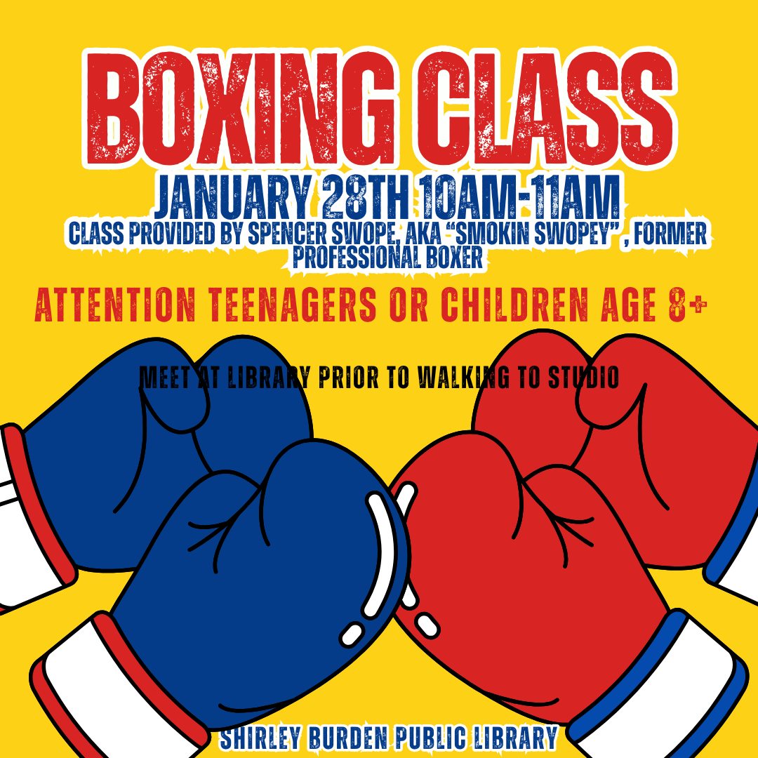 The class will be led by Spencer Swope, also known as “Smokin’ Swopey,” a former professional boxer and owner of Sweet Science Boxing Club, a new business located directly across the street from the library. The session is designed as an introduction to boxing and is geared toward ages 8 and up, with a particular emphasis on teenagers. Participants are asked to meet at the library before walking together to the boxing studio and should arrive dressed for a workout.