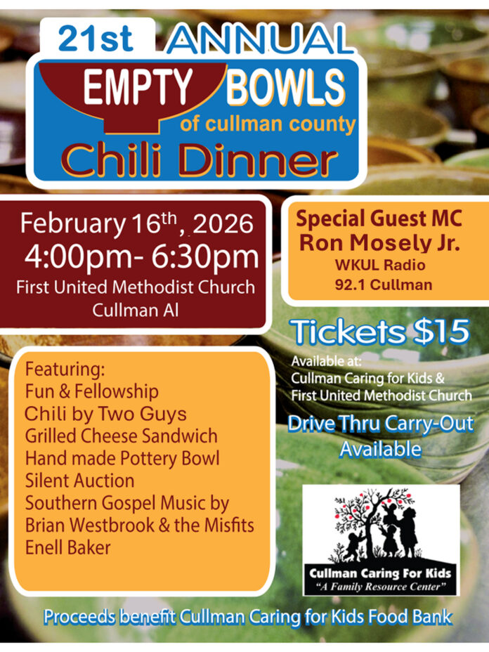 CULLMAN, Ala. — The 21st annual Empty Bowls of Cullman County Chili Dinner will take place Monday, Feb. 16, 2026, offering the community an evening of food, fellowship and fundraising in support of the Cullman Caring for Kids food bank.