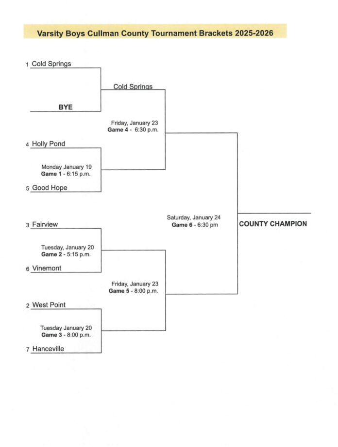 CULLMAN, Ala.- The Cullman County Board of Education released the complete brackets for the varsity boys’, varsity girls’, junior varsity boys’ and junior varsity girls’ county tournaments on Tuesday. The tournament games will take place from Jan. 17th-24th and all contests will be played at Tom Drake Coliseum at Wallace State Community College.