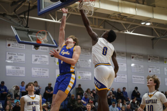 The second quarter was much of the same from Cold Springs. In one play, Hallmon blocked Jackson’s shot, grabbed the rebound and slung a dime downcourt to Ayden Black who put in a layup to go up 19-5. While the Eagles didn’t waver, Falkville did begin to get shots to fall. They resorted to outside looks often due to the Eagles’ stellar perimeter defense, but got a couple threes by Eli Harris and Landon Fields to fall to open the quarter. The pick-and-roll combo of Black and Hallmon for Cold Springs is a key driver on both sides of the court, and they both put on a show in the second quarter. Before halftime, Black picked off a pass and took it coast to coast for a gliding layup. The Eagles were up big, 33-16 at the break, but the Blue Devils were just beginning to show some rhythm.
