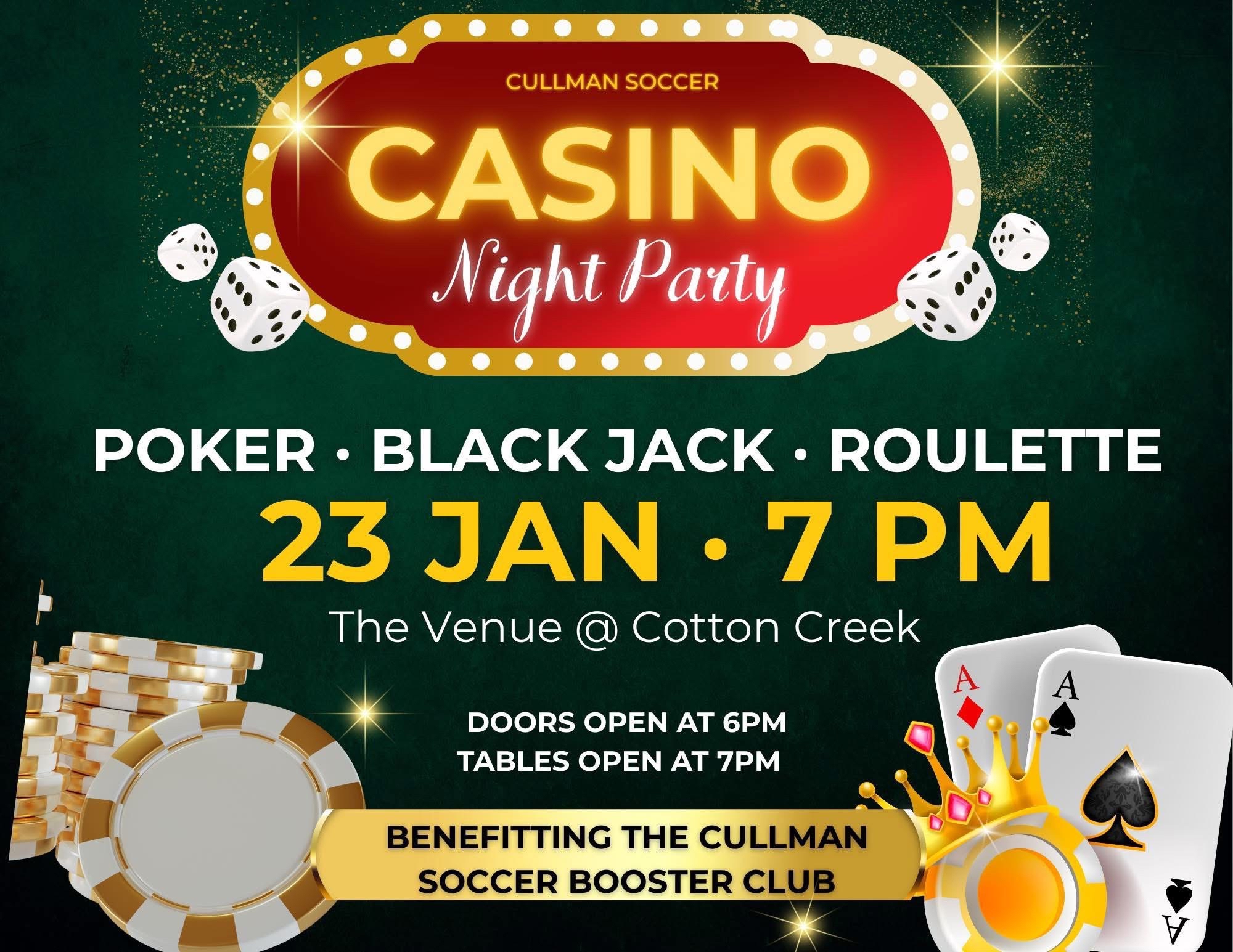 The event, benefiting the Cullman Soccer Booster Club, will run from 7-10:30 p.m., with doors opening at 6 and gaming tables opening at 7.