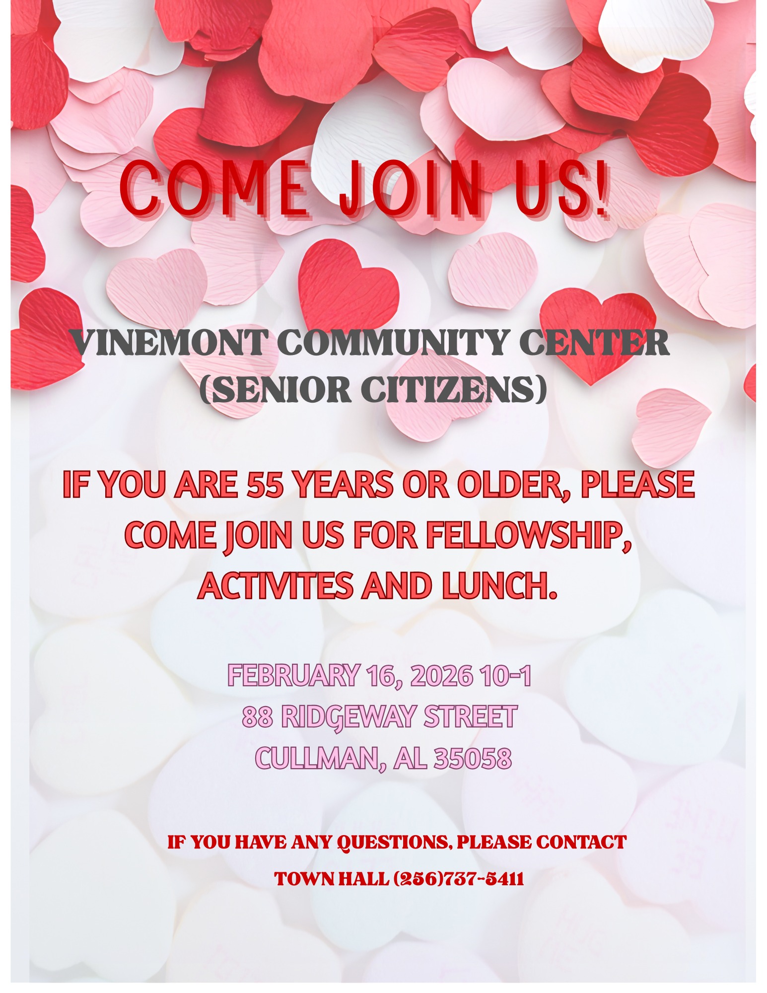VINEMONT, Ala. – The Town of Vinemont will host a Valentine’s Day-themed senior community luncheon on Monday, Feb. 16, from 10 a.m.-1 p.m. at the Vinemont Community Center.