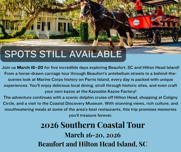 The Southern Coastal Charm Tour runs March 16–20, 2026, with travel to Beaufort and Hilton Head Island, South Carolina.