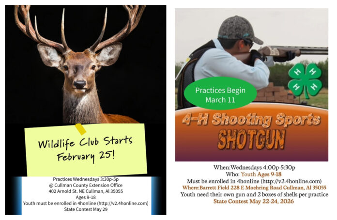 The 4-H Wildlife Club will begin meeting Wednesday, Feb. 25. Practices will be held Wednesdays from 3:30-5 p.m. at the Cullman County Extension Office, located at 402 Arnold St. NE in Cullman.