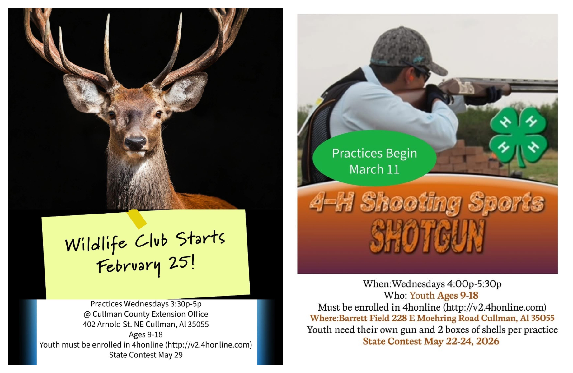 The 4-H Shotgun Club will begin practices Wednesday, March 11. Practices will be held Wednesdays from 4-5:30 p.m. at Barrett Field, located at 228 E. Moehring Road in Cullman.