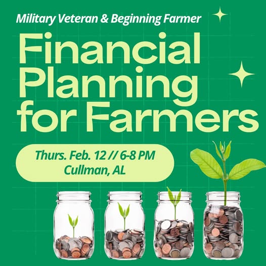 CULLMAN, Ala. – Small and upcoming farmers are invited to attend a Financial Planning for Farmers Workshop on Thursday, Feb. 12, 2026, from 6-8 p.m. at the North Alabama Agriplex. The free workshop is part of the Military Veteran & Beginning Farmer series and is sponsored by the Cullman County Cattlemen and Cattlewomen.