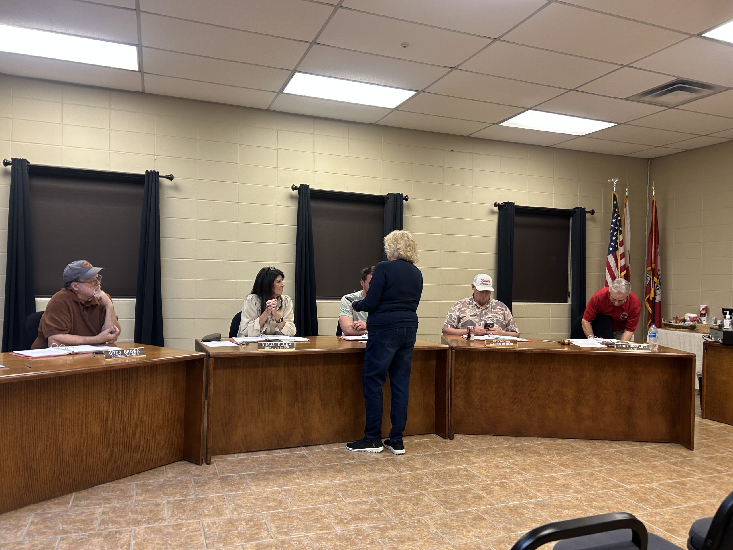 Council members discuss a matter with a resident at the meeting on Feb. 9, 2026. (Anabelle Howze/The Cullman Tribune)