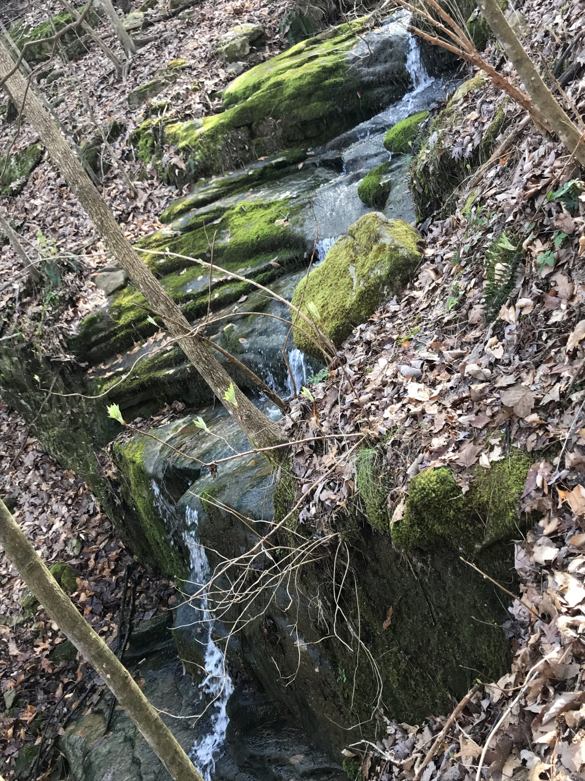 I hadn’t realized the intricacy of moss and stone in my previous visits. It had rained a day or so prior so the falls were flowing majestically into the creek. Constant overflow created tiny babbling brooks the moss seemed to guide to the larger body of water. Leaves from surrounding trees had all fallen and elegantly framed the moss lining the creek with its earthy brown tones.