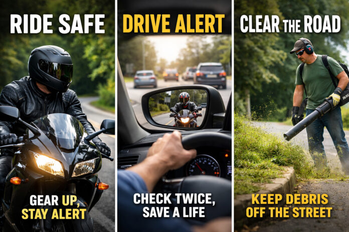 Riders must wear appropriate protective equipment and maintain their machines. Drivers must remain attentive and account for smaller vehicles in traffic. Property owners must consider how their yard work affects roadway conditions.