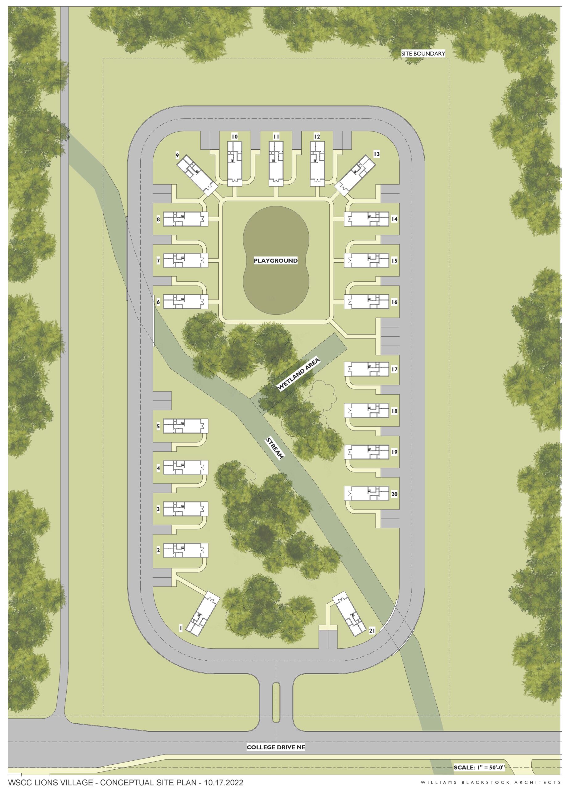 The planned residential community will include 10 micro-dwellings, fully equipped to provide most of a student family’s needs. The village is designed to accommodate expansion to 20 dwellings, along with an on-site childcare center featuring four classrooms and a designated tornado shelter serving both residents and the surrounding community.