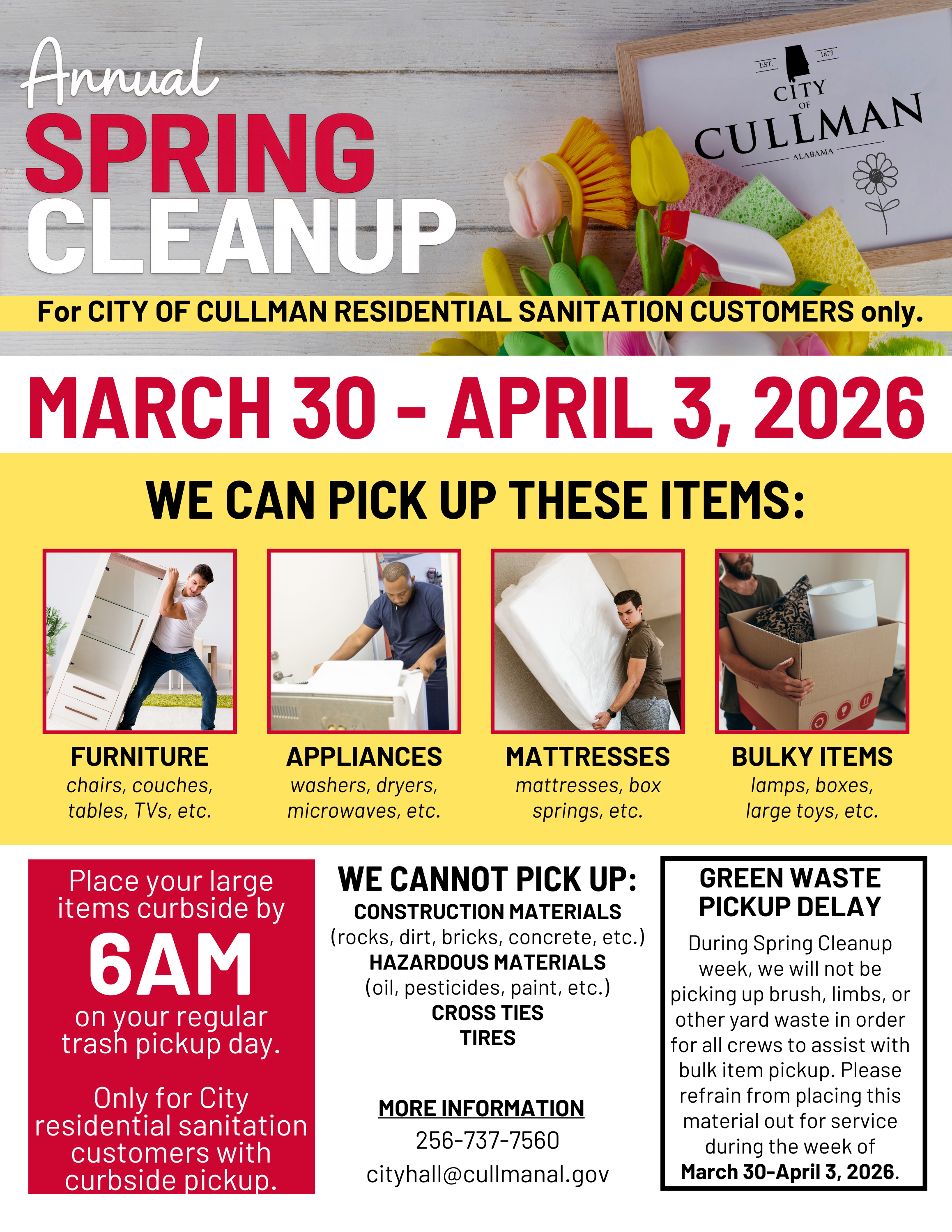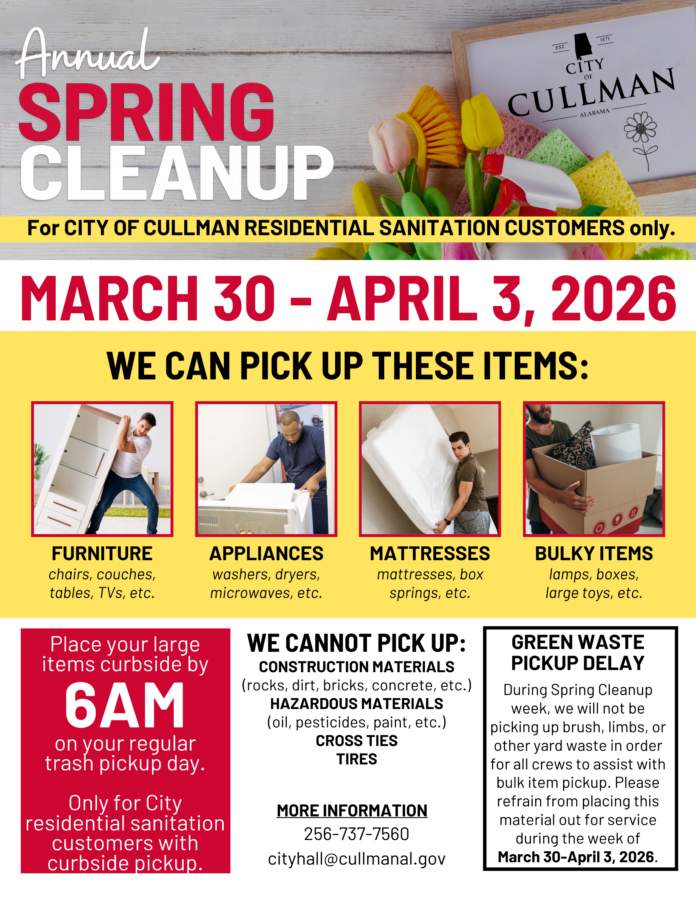 CULLMAN, Ala. – It’s time to clear out those large items taking up space at home. Cullman’s annual Spring Cleanup is set for March 30 through April 3, 2026. This special pick-up event is available to City of Cullman residential sanitation customers with curbside service.